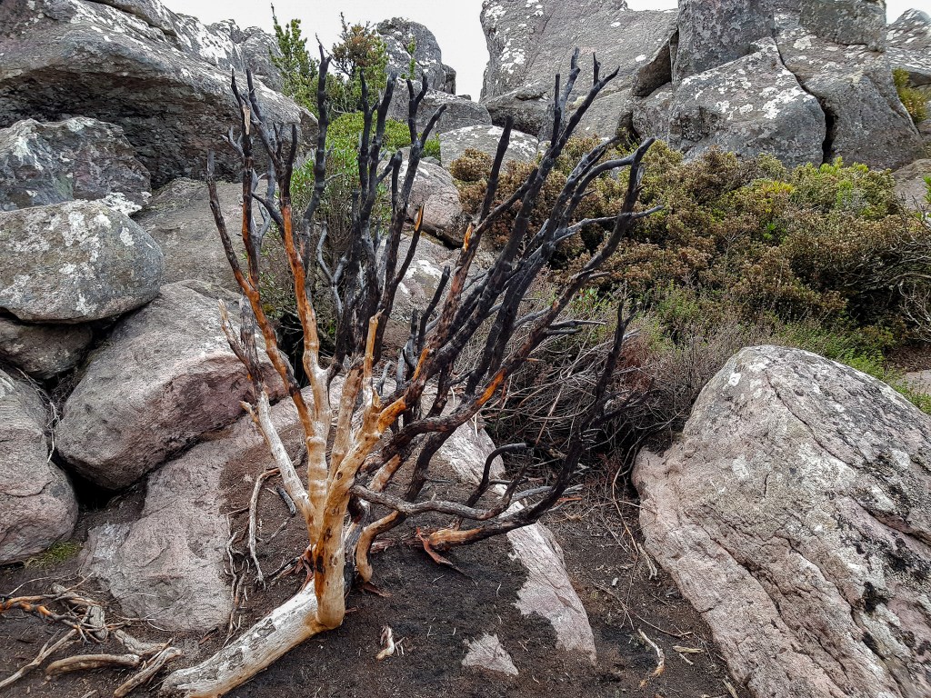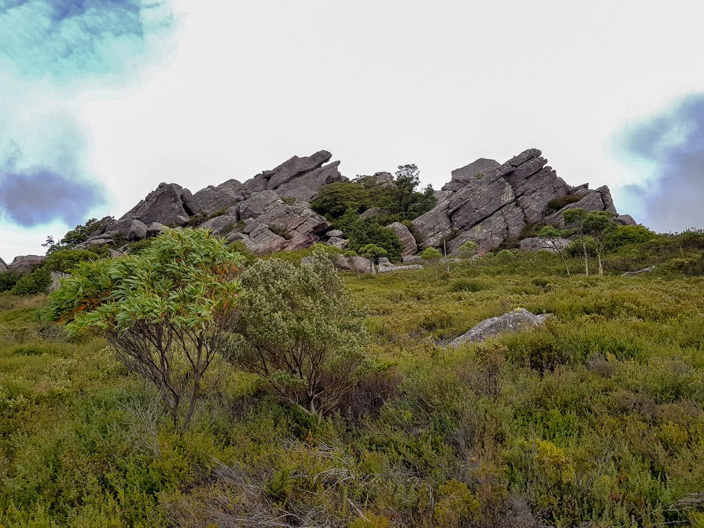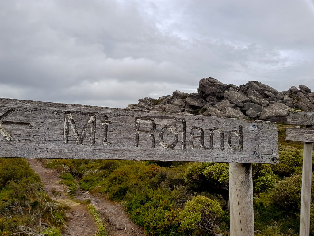We noticed our steady ascent more in our legs than anything else, the scenery now consisting mostly of rocky outcrops barely hidden amongst the buttongrass, banksia and open plains. There was a lot of wombat scat, so I suspect wombats could be seen at the right time of day (which would involve returning in the dark so I absolutely do not condone it). Suddenly we were standing in a biosphere of spikey alpine scoparia (the most beautiful flowers in the right season, but autumn is not the right season), huge piles of boulders and a weathered wooden sign reading “Mt Roland”. After 3 hours of walking we had reached the base of the summit, which is reached with a final, frantic boulder scramble, and marked with a trig station. The farmland patchwork of the Meander Valley stood below us to one side, and the endless wilderness of state reserve stretched to the other, giving the impression that Mt Roland is the border between two worlds.