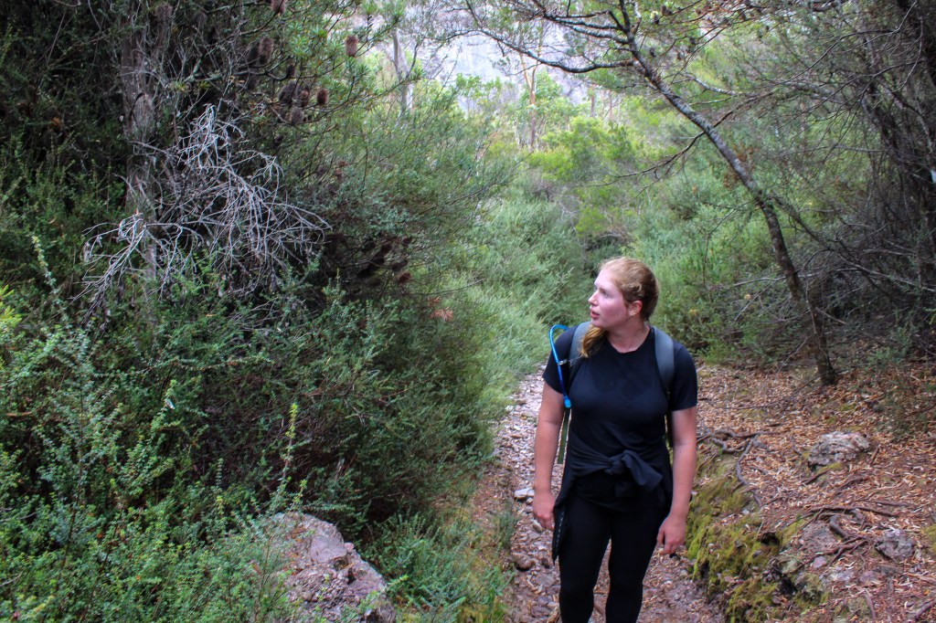 It was with a sigh at the merciful gust of cool wind that we emerged from the cloisters of the forest section to the lookout (just after scrambling over some small rocks in a directly uphill fashion). We stopped for a short lunch break overlooking the track so far.