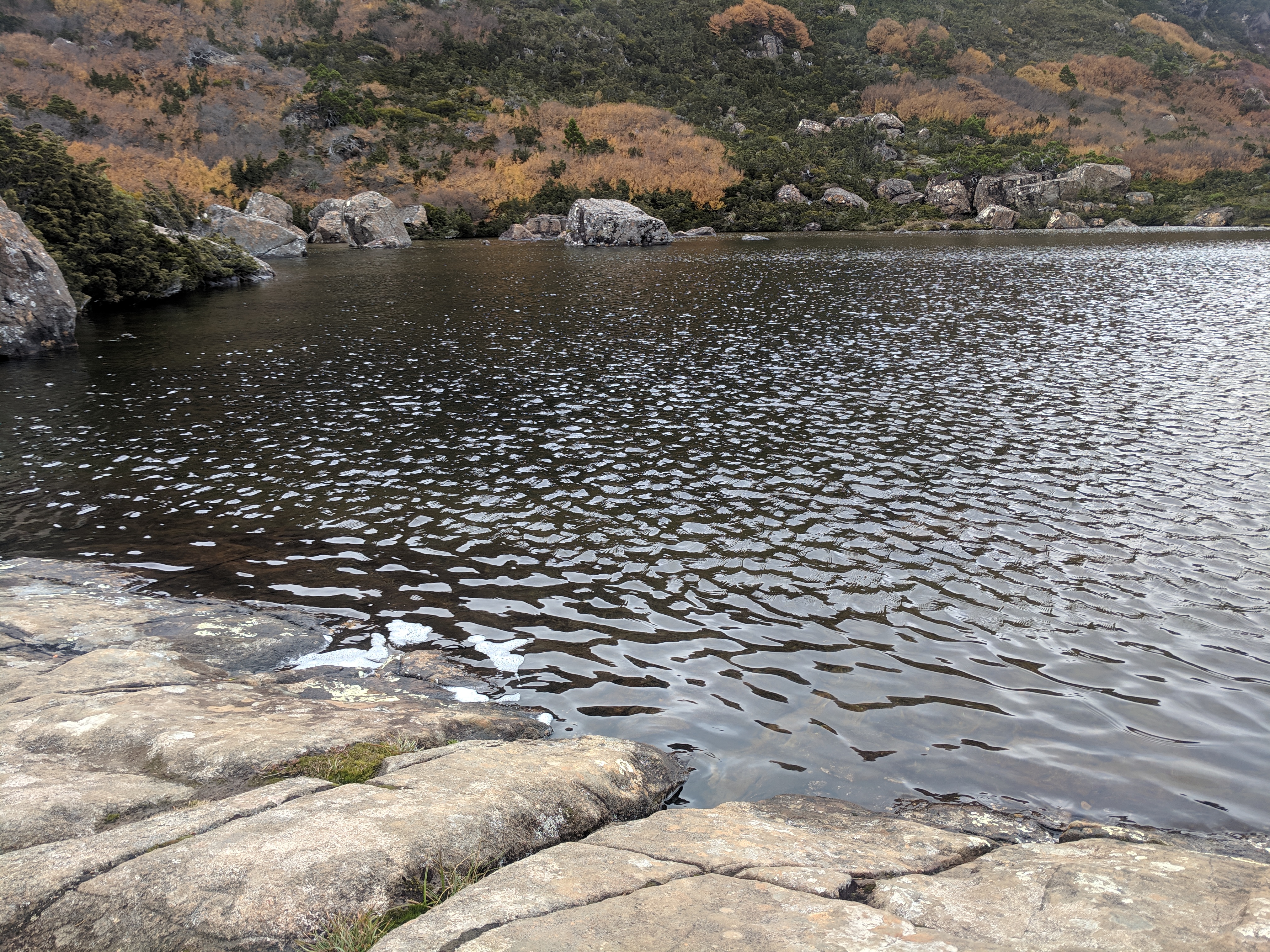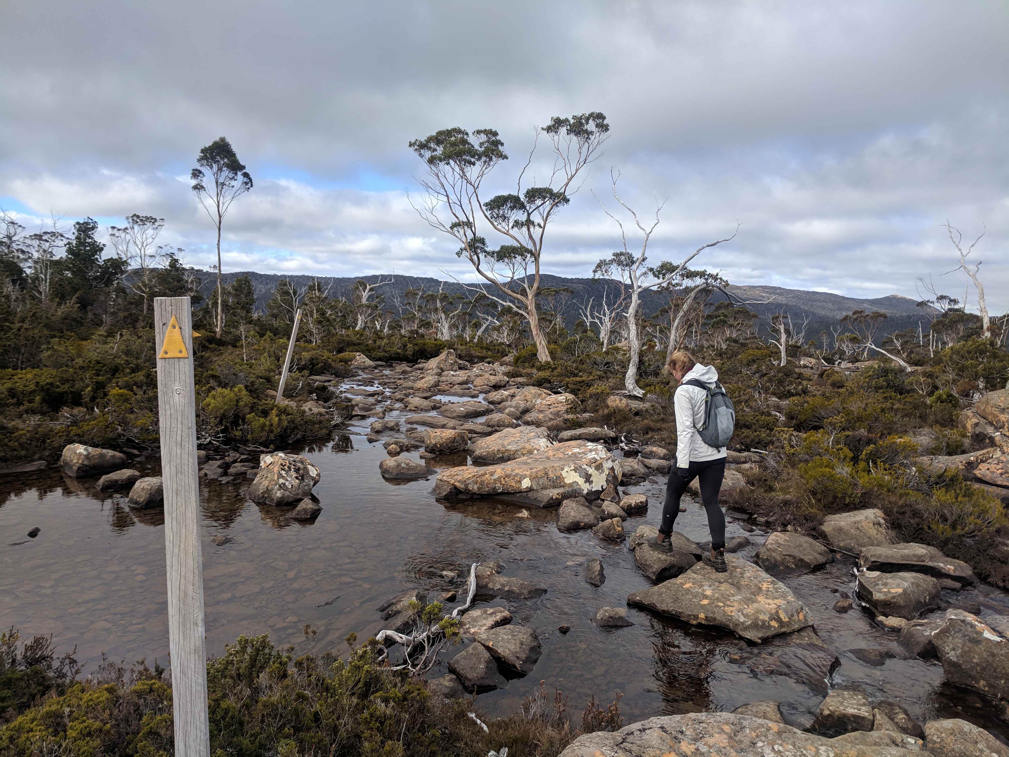 It was immediately apparent that the full track is a less commonly traversed. The duck-boards were rickety in places and dilapidated or completely worn away in others. The sense of remote wilderness adventure is heightened by the state of the path (just don’t step on the boards with eyes in the wood and be ready to catch yourself if you foot falls through). The only thing that improved the sense of solitude were the parts of the walk where the path basically didn’t exist. There are a few areas where leaping on rocks through streams is actually part of the marked path. I was incredibly glad that we had good boots on, but we both agreed that it would be terrifying in the snow (apparently the various tarns actually freeze over in winter). The full track took us past Rodway Range, Twilight Tarn, Lake Webster and a few other little adventures along the way. Each step took us closer to complete seclusion until the sounds of fellow travellers was completely vanished and only the occasional (presumably extremely cold) frog call, and bird song was all the we could hear. We managed to walk for at least an hour without seeing a single other person and those that we did see between the Tarn Shelf and the Lake Dobson carpark return loop were few and far between.