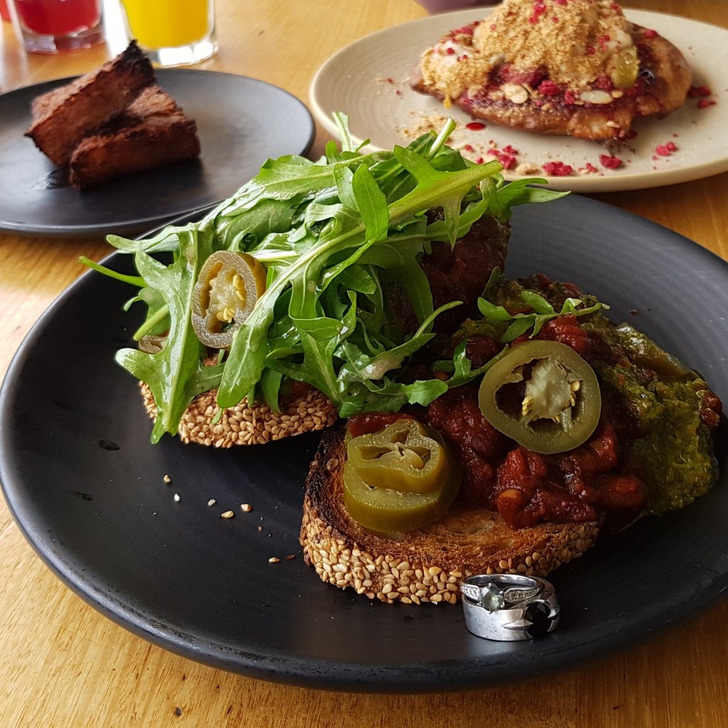 We woke up late on Sunday morning, and were very slow getting out of the house because I spent most of the morning googling the menus of cafes around. We settled on Ginger Brown, a popular café in South Hobart and it had the highest number of vegan options of the cafes we looked at. We had a romantic and intimate brunch sitting outside (near the dog-water bowl on the off chance that there would be dogs to pet – there were!). We had house-made baked beans and a cinnamon hot-cake (we shared both meals). There were baked goods on display (and I assume sale) inside the café, some of which were vegan (we didn’t get any on account of our plans to go to Farmgate Market), and we had no trouble at all finding incredible, wholesome food with no sulphites, and no animal-bioproducts, and we were already pretty full by the time we got to the Melville street car-park for the Farmgate Market.