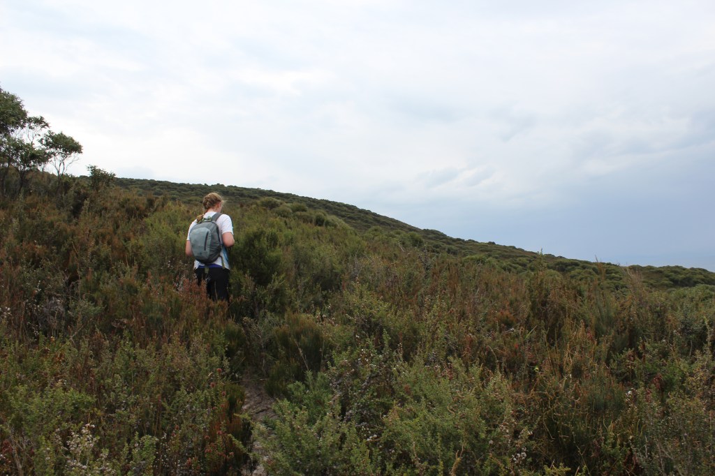 The higher up we walked the more it became apparent that this path was falling into disuse and disrepair. The now hip/shoulder height (on 6ft humans) plants were so over-hanging that we were forced to put on our rain-jackets just to protect our arms from the scratching shrubs, hell bent on drawing first blood. One particular offender that came to be known as ‘the spikey mother-dearer (only we didn’t say ‘dear’)’ was the very inaptly named ‘pretty heath’ in which the term ‘pretty’ is used to mean will-claw-your-eyes-out-if-you-aren’t-wearing-safety-goggles. The paw-paw ointment was well received when it came to break time.