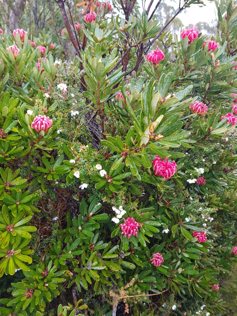 Waratahs abounded in the first section of the track. There was a whole grove of them! Sommelier very graciously put up with me pointing out each tree individually even though he could very definitely already see them, and there were literally hundreds of them, but my desire to see wild Tasmanian waratahs in flower was much of the driving force behind our decision to give Hartz an whirl. The scoparia that we found in flower was an unexpected blessing that elicited such an excited gasp from me that Sommelier was genuinely concerned that I had seen a snake an instinctively froze in place. I am told there are lovely views stretching across the Huon Valley and up into the rainforest from the track. I am unable to officially confirm this on account of the very heavy mist from which only the brilliant reds of the waratah and scoparia, and the incredible green of the cushion plants could be made out (in terms of colours anyway, the pandani made some very sinister, looming shapes that may have intimidated certain members of the couple who have never fully overcome her Day of the Triffids related nightmares).