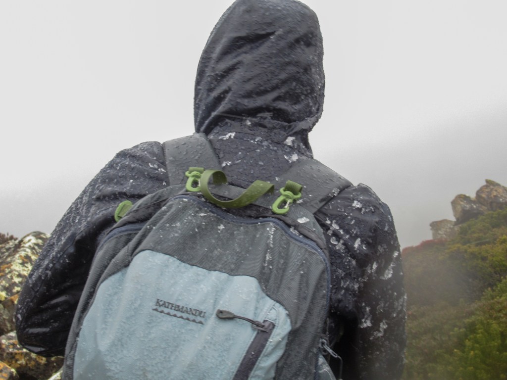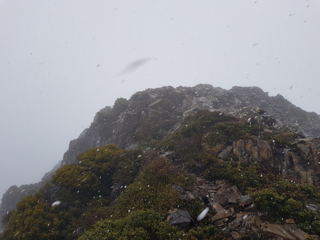 This particular day, the first day of Tasmanian summer to be exact – rudely – saw snowfall, heavy rain and winds measuring around 20-30Km/h (which didn’t sound like a lot to me on the ground, but it felt like a lot on the mountain). Knowing there would be bad weather we started out in thermals and water-resistant hiking pants, with an additional woollen layer each and our warmest snow jackets. Mine is a down-lined raincoat from Kathmandu. I am so in love with the jacket that I think Sommelier might be getting a little jealous. We also packed our lightweight raincoats (as an extra layer), and beanies. I packed a hiking ascot, but Sommelier forgot his, and he packed gloves, but I forgot mine. We agreed to share the gloves – more on that brilliant plan to follow. We waterproofed our bags with bin liners, wrapped the cameras up safely and agreed to mostly use the slightly more waterproof but poorer quality phones for photography purposes. Our 2ltr bags of water and some scroggin and biltong were also very carefully packed, but due to a disgusting-sludge situation we did not pack our big 10ltr container that we usually keep in the car, instead we drank a lot before leaving the house. The most important cold weather survival information I have ever received actually came from my recently deceased uncle, who was an Antarctic marine biologist: you are in just as much danger of dehydration in cold weather as in warm. Cold weather sees our body’s energy directed towards your core, which increases urinary output. It is irresponsible and incorrect to assume that, just because you need to pee more, you have sufficiently hydrated.