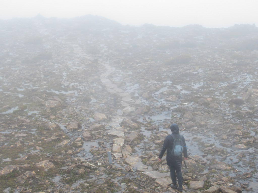 In a very confusing series of events the peak of Hartz mountain emerged from the mist much closer than we anticipated (and promptly disappeared from view again), the sun suddenly made an appearance, and so did the view of what Sommelier assures me is lake Esperance, one of the many attractions that can be viewed from the mountain. We scurried up the rocks that make up the path to the summit in a desperate bid to catch a look at the view before it disappeared behind the thick grey clouds we could see brewing in the distance. Halfway to the top (I think, I could not see the top), we turned around to see what we could see and were immediately hit in the face by sleet being driven by winds at around 30km/h (which is, I now know, enough to turn a sleet flake into a small weapon, especially when aimed at the eyes). Spurred on by speeding sleet we beat a very hasty path to the nearest rock that we could both fit behind and took a little shelter.