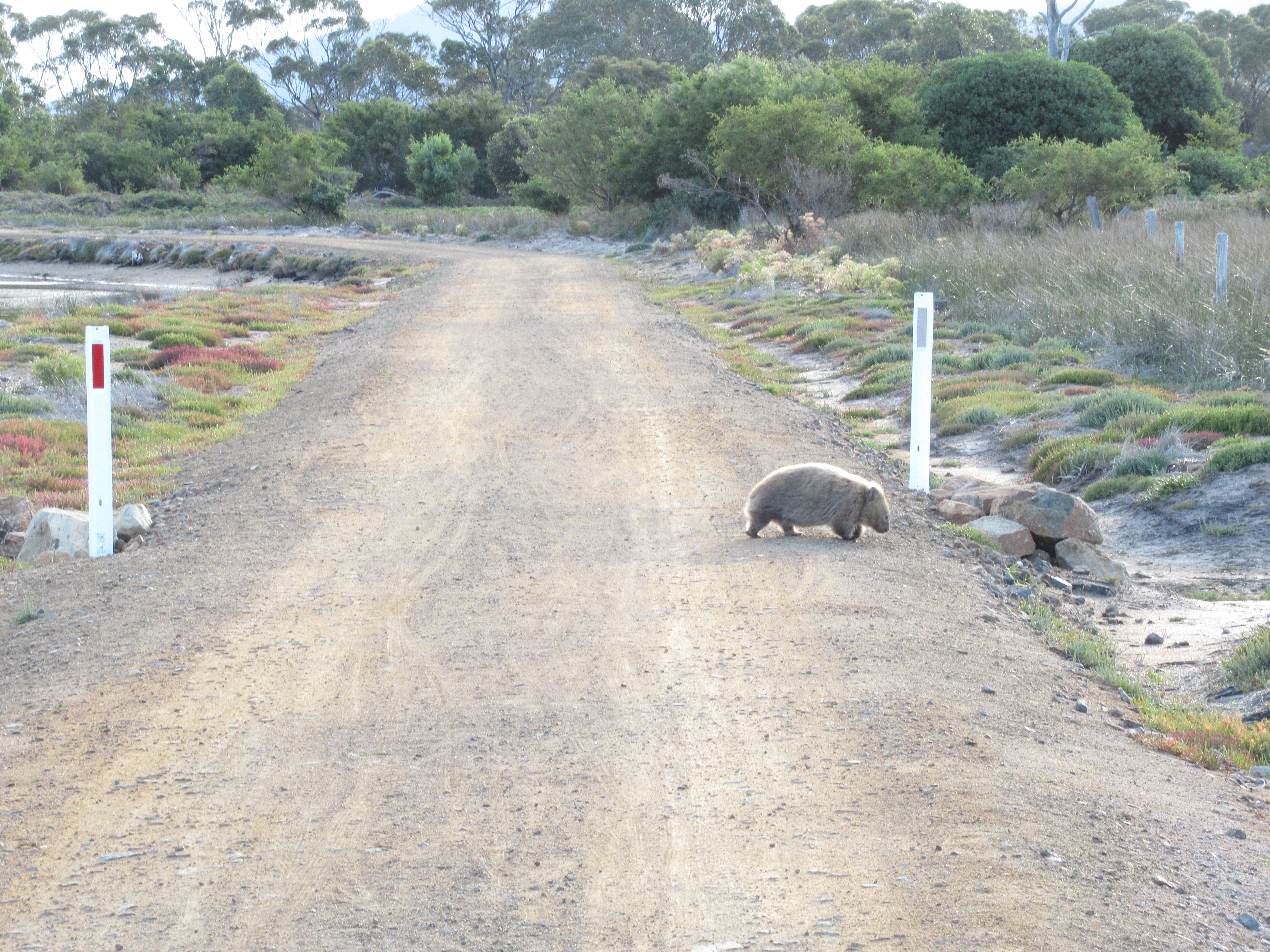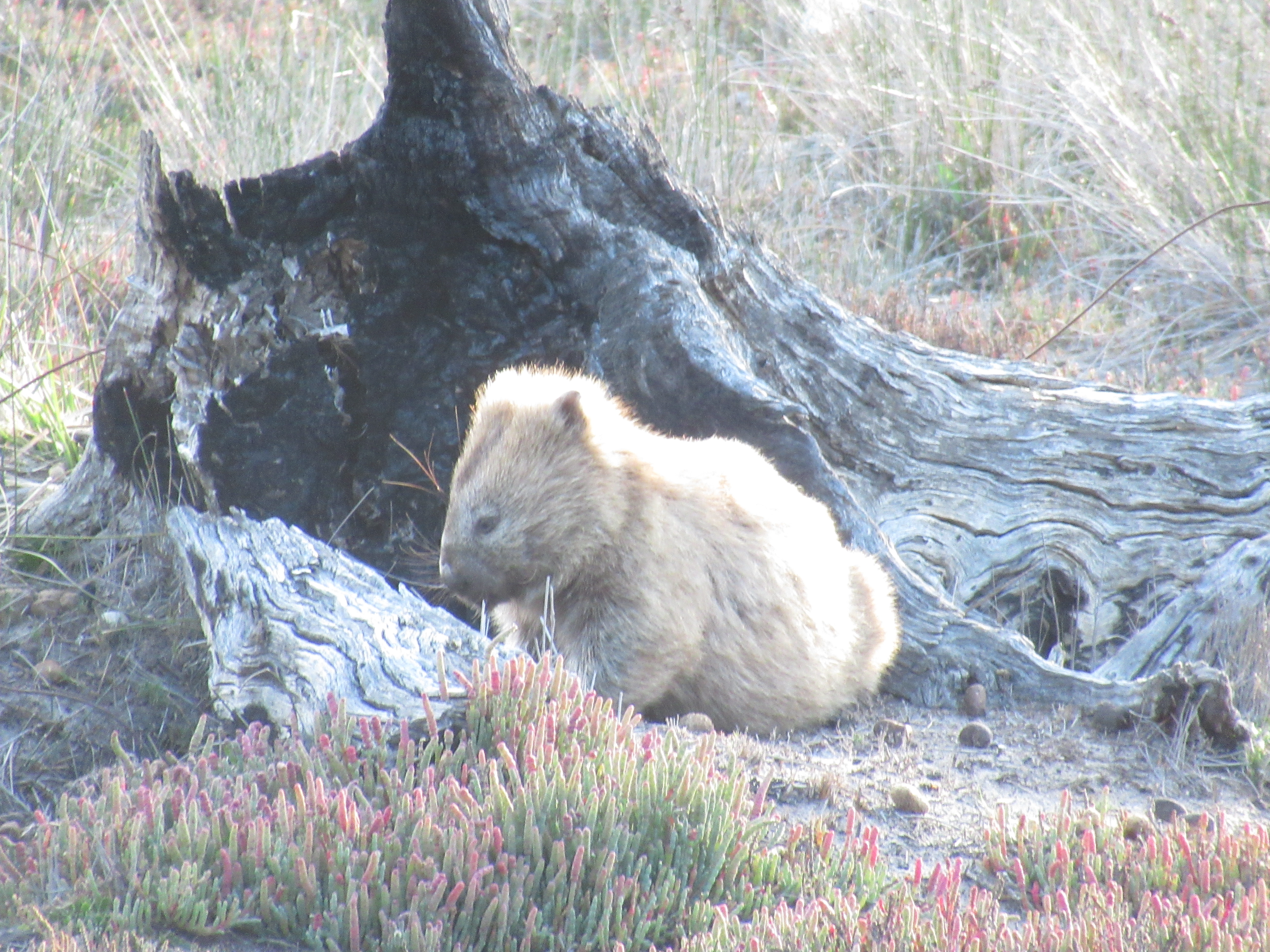 We dragged ourselves home, stopping frequently, quietly grateful that it doesn’t get dark in Tasmania in summer until around 9pm so we had enough light to see by. The unexpected benefit of our lengthy detour was that, being out in the evening hours radically increased our chances of seeing Tasmania’s nocturnal mammals (an astonishing proportion of which are critically endangered). We were near the French’s Farm campsite when the unmistakable guttural growl of the Tasmanian Devil broke the early evening stillness and heralded the start of nocturnal prowling. Wombats lumbered lazily about at frequent intervals and we made our way back to camp via the Convict Cells walk so as to better see even more wombats (we has excitedly told a park ranger that we had seen 5 wombats there and he helpfully informed us that there were probably about 500 – he was not wrong, most of the ‘rocks’ on the sparsely covered hills by the convict ruins turned out to be the bare- nosed wombat. We stopped counting how many we had seen.)