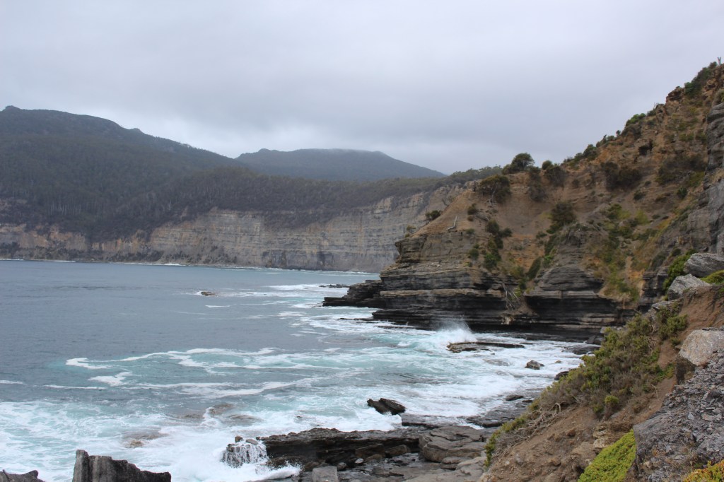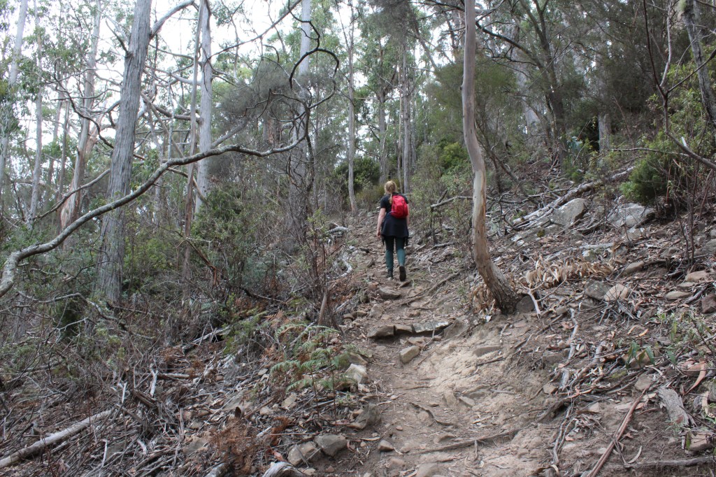 Satisfied that our tent was tied down and no food was stored inside it we set out at around midday on the notoriously difficult hike (grade 4) to Bishop and Clerk. The track begins from Darlington and you can take the short way which heads straight to the track, or the long way which runs around the Maria Island Airstrip (which is still an active airstrip so please keep to the marked path and do not just roam aimlessly around the big open airfield), along Fossil Cliffs and off into the she-oak forest that marks the formal beginning of the Bishop and Clerk walk. We took the scenic route on the way out and the direct way on the way back (there were convict ruins that I really wanted to see). We stopped to admire the length of the Cliffs and the hundreds of fossils deeply embedded therein. It was an overcast and rainy day and the ocean was churning up particularly huge, loud waves, which served as a sea-sprayed reminder that the ocean is very slowly reclaiming the fossilised remains of her creatures.