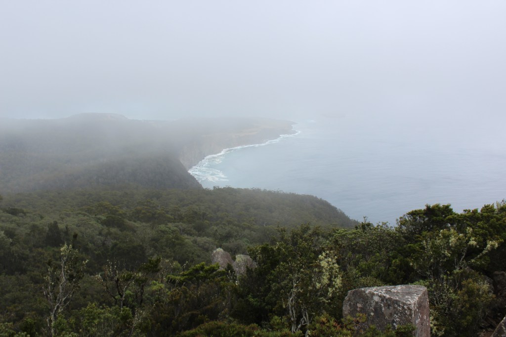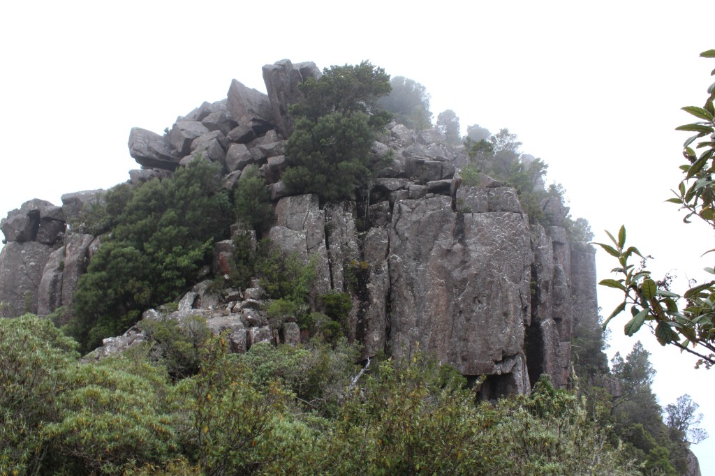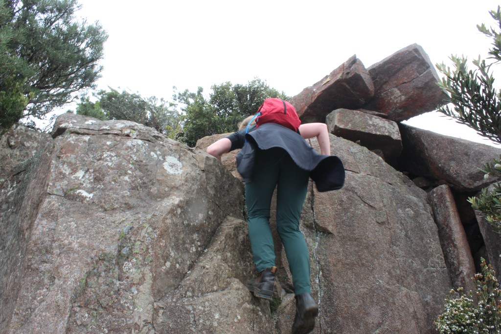 After a little over an hour the rainforest ends abruptly in the face of a field of small rocks. The path zig-zags through these sharp little rocks with relative comfort and, while the path markers are not always extremely obvious they are not strictly necessary as the path is well worn and clearly very popular (although we saw very few other people, likely because of the weather). The openness of this section lent itself well to viewing the path already travelled, the Fossil Cliffs being clearly visible, and the ocean being easily audible from our vantage point. Small rocks turn to boulders and, while the track mostly weaves around the boulders, it is here that the hike earns its title as a “challenge”. Sommelier and I are both reasonably fit and 6ft tall so we had little issue in the sections where actual rock-face scrambling is necessary. We wear Blundstone boots, but you may find it easier in proper hiking boots with deeper tread. Granite can become very slippery when wet so we proceeded with extreme caution. It was lightly drizzling with low clouds being blown across our path, briefly enveloping us in the sky, before dispersing into the wind when, with a heavy grunt and a frantic, blind scramble for a hand-hold I emerged at the top. Like a child peeping over the table to see the Christmas feast laid out I caught my first glimpse of the perfectly flat summit of the Bishop and Clerk walk. Sheer cliff with the rainforest and ocean below were visible in the occasional partings of the clouds and the looming figures of the rock formations known as Bishop and Clerk, for their resemblance to a Bishop and a Clergyman, respectively.