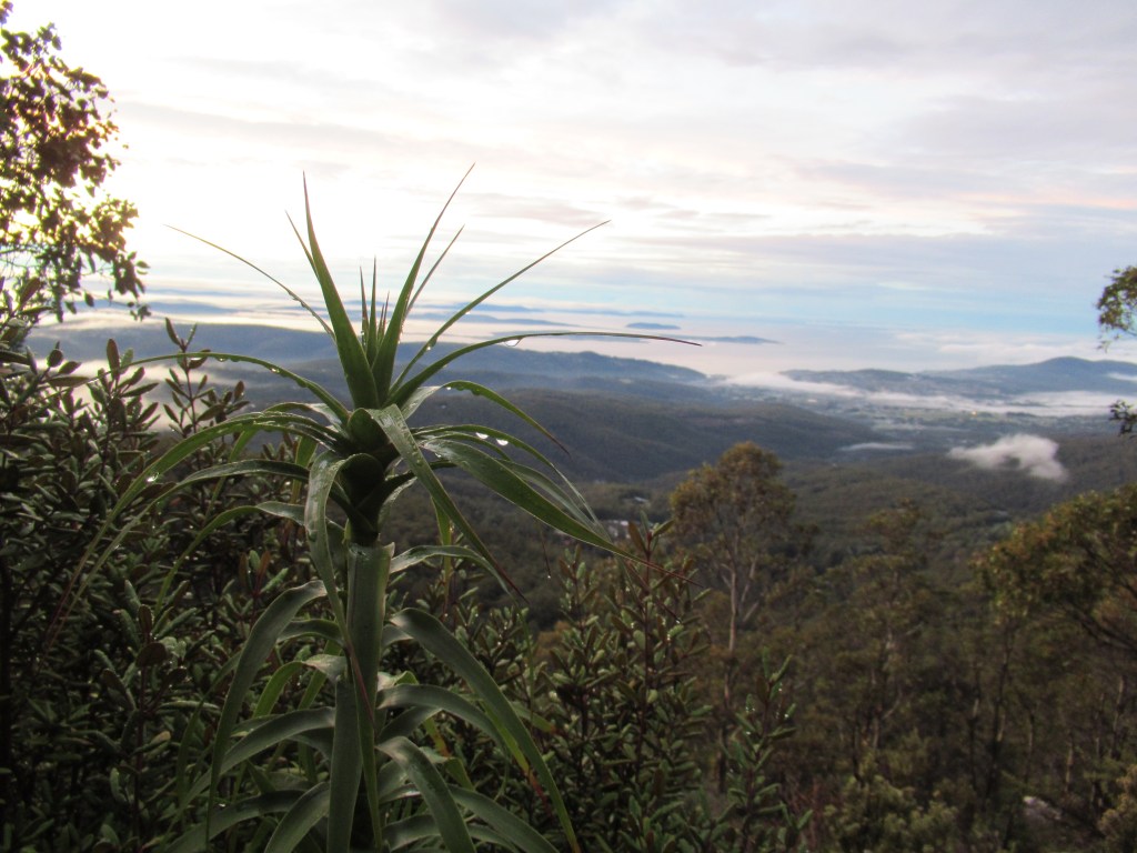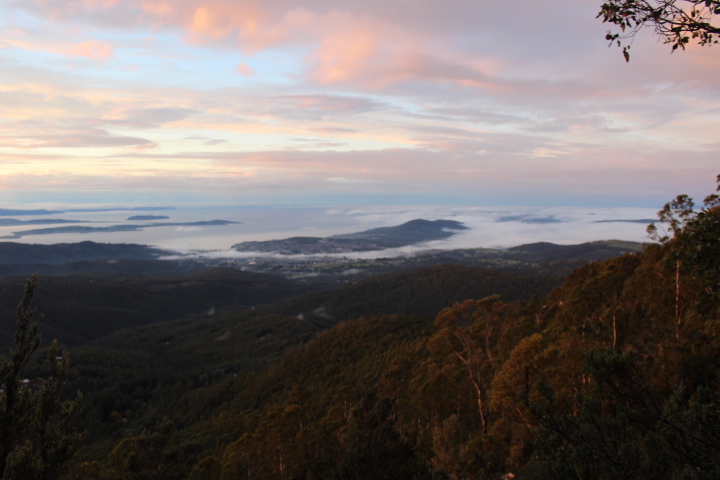 Knowing vaguely which track to take and wanting to beat the crowds we headed up the mountain without locating a walker’s logbook (we texted a friend our plans, and set out). The track departs from the top of the Springs carpark, intersecting with the road twice before crawling slowly upwards while skirting around the side of Kunanyi/ Mt Wellington. Occasional clearings offer views across the Derwent River towards, and well beyond Kingston, although our views were interrupted by the thick winter fog, illuminated by the burgeoning sunrise.