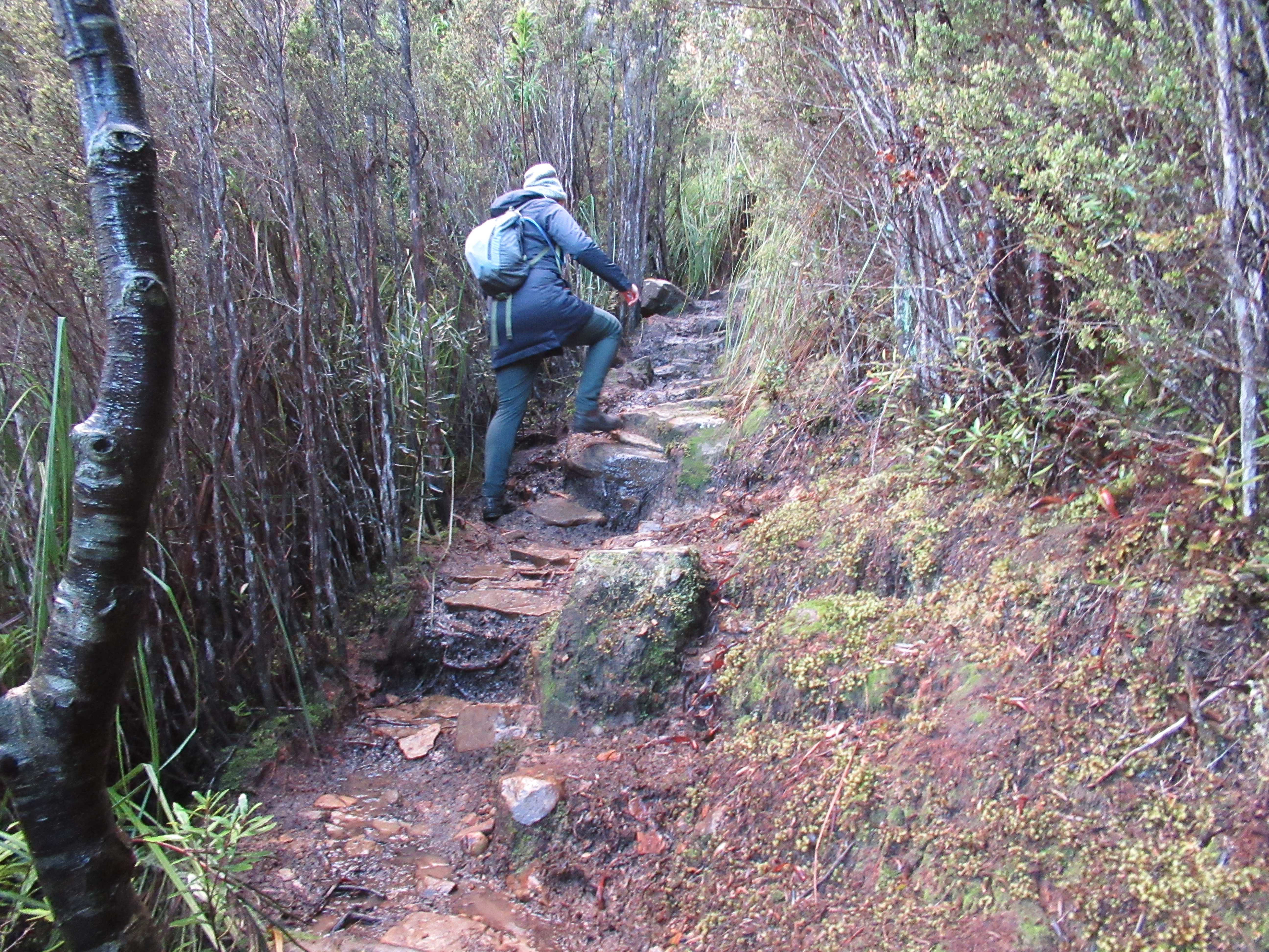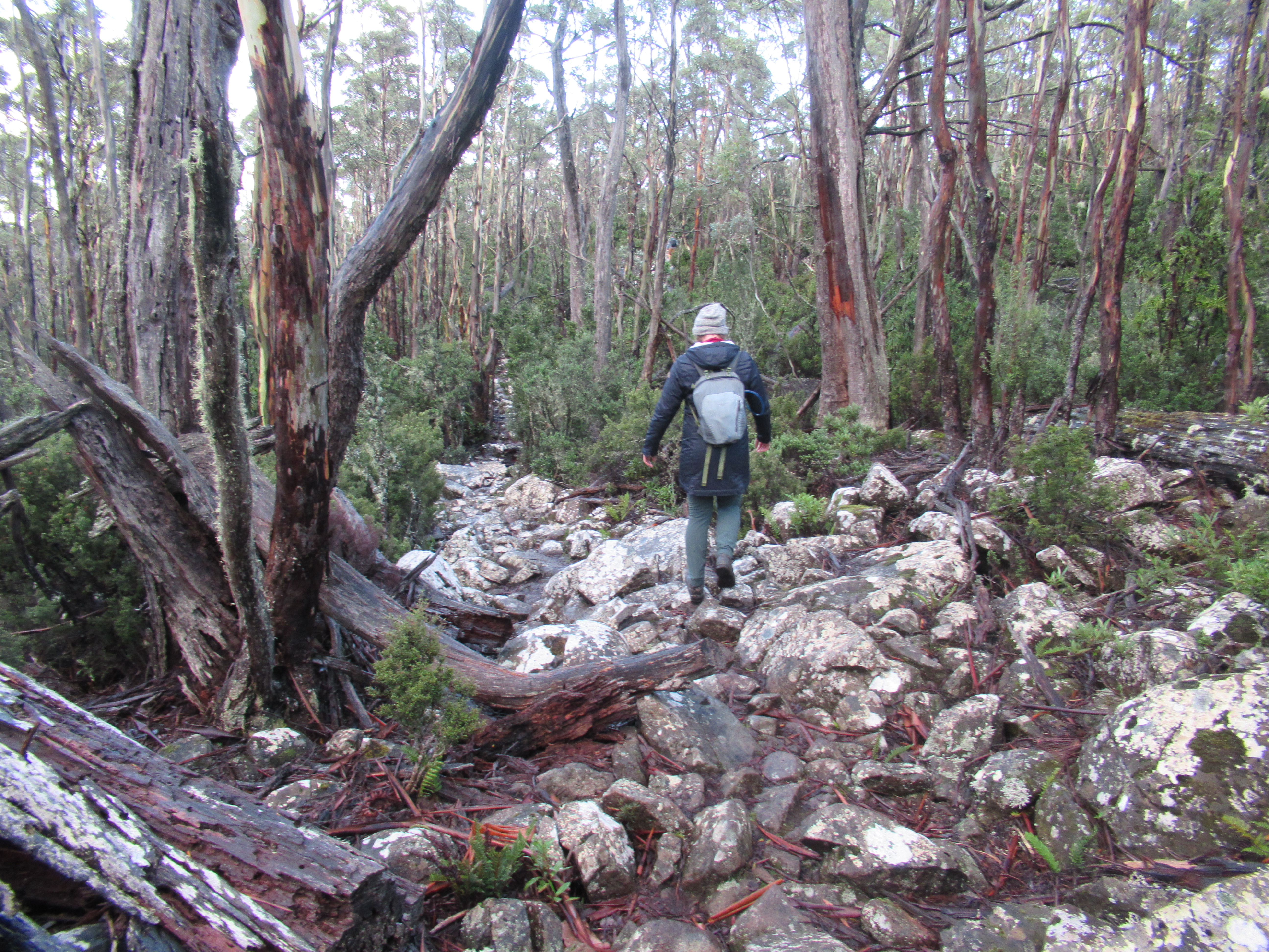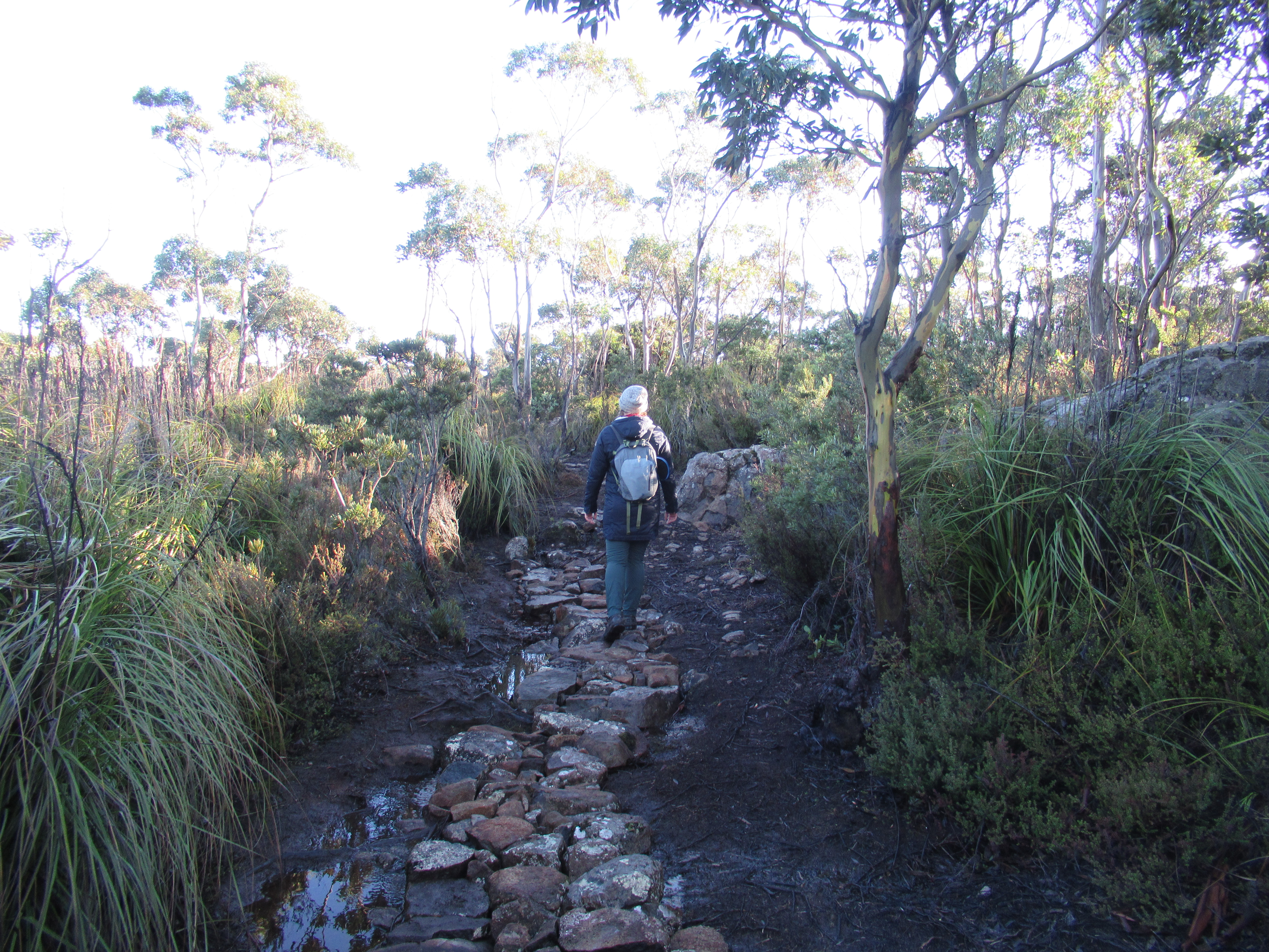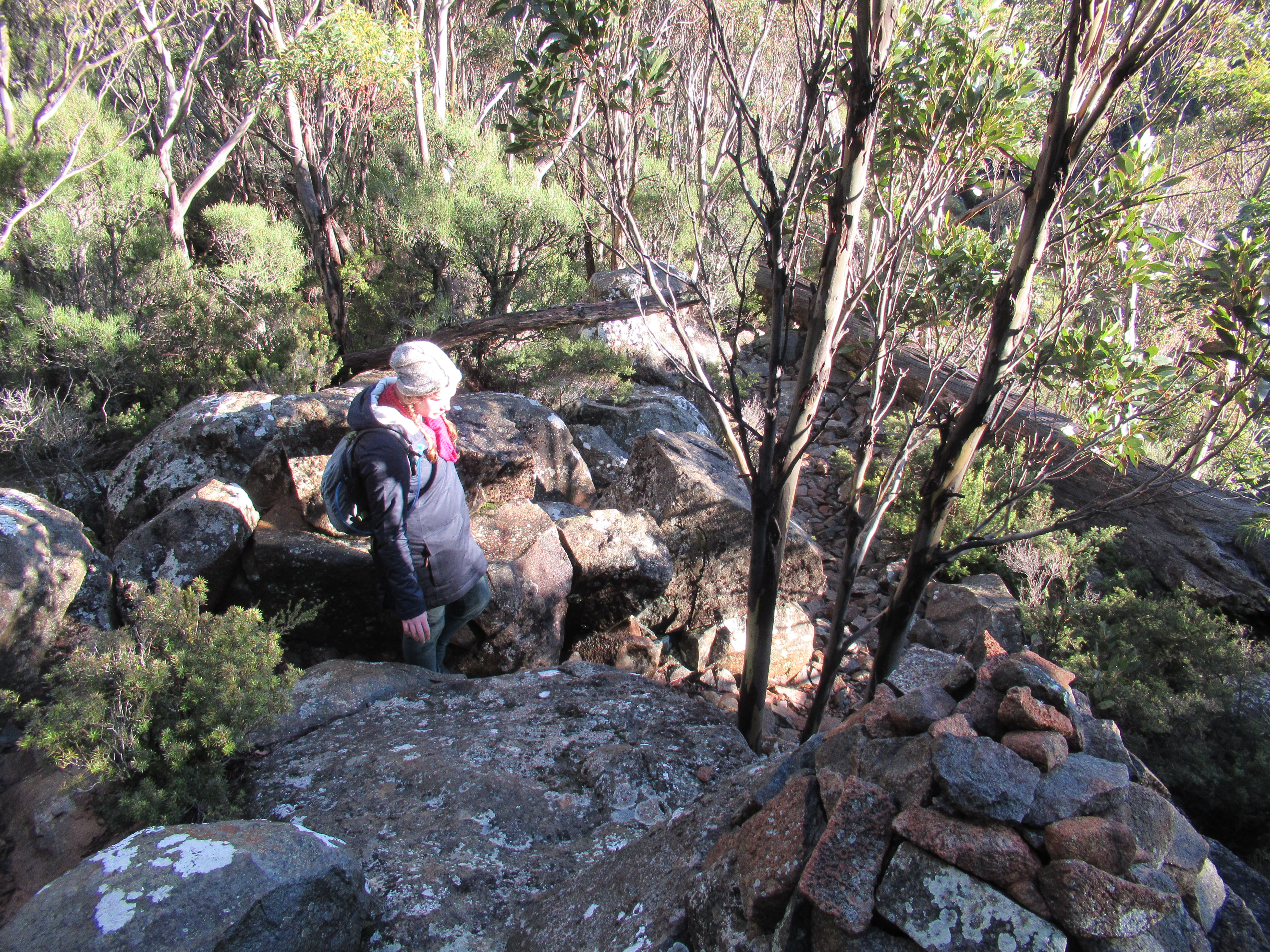 The track rises steadily and reasonably comfortably through a pleasant selection of dragon heath and native pink berries before turning into a gum forest, interspersed with small boulder scrambles. For the most part the path is very obvious and minimally marked as a result. Due to it being mid-winter and snowfall being a fairly common sight on the mountain we had thoroughly rugged up, but found ourselves to be somewhat overdressed under the warmth of the heavily forested track.