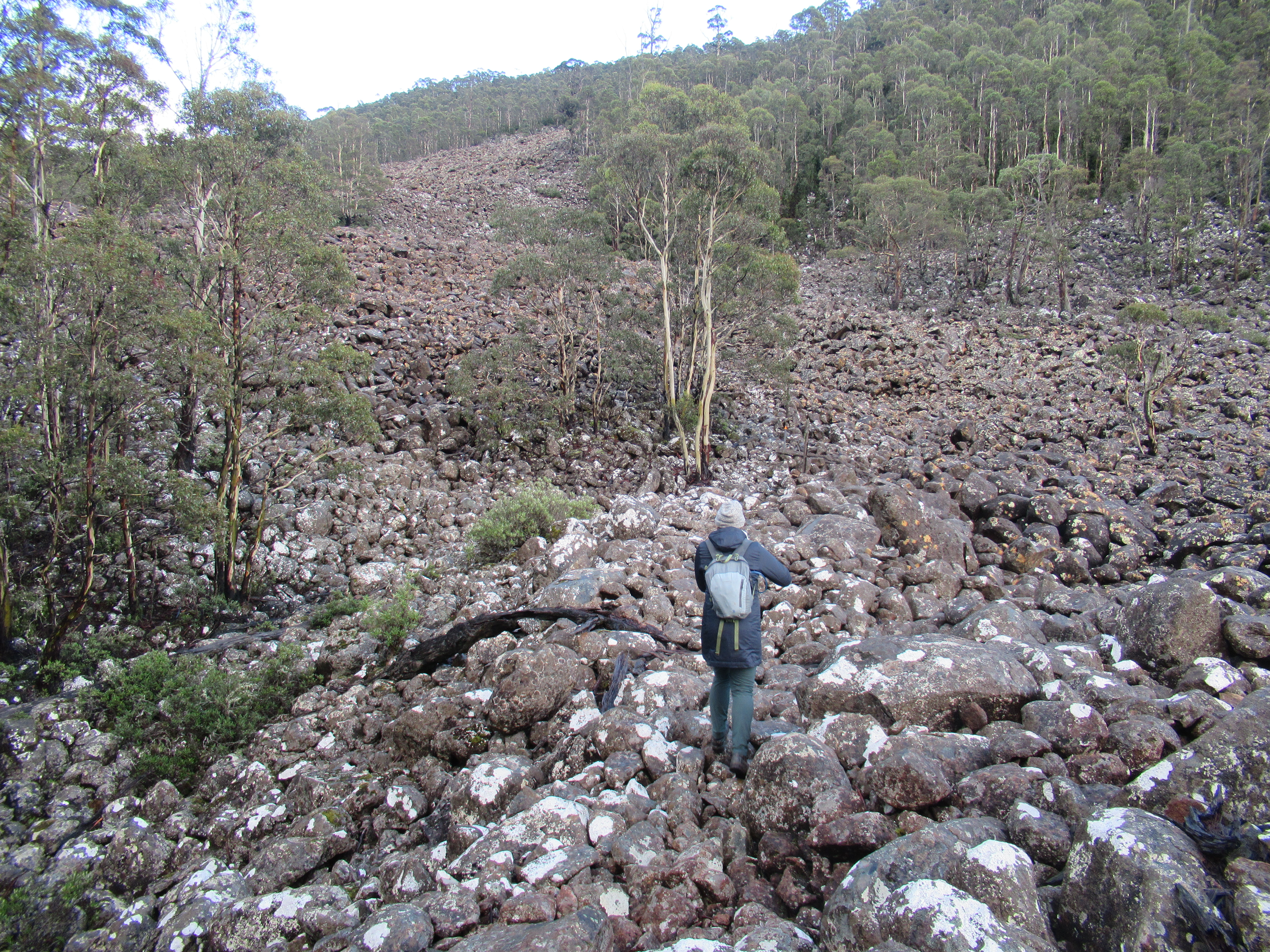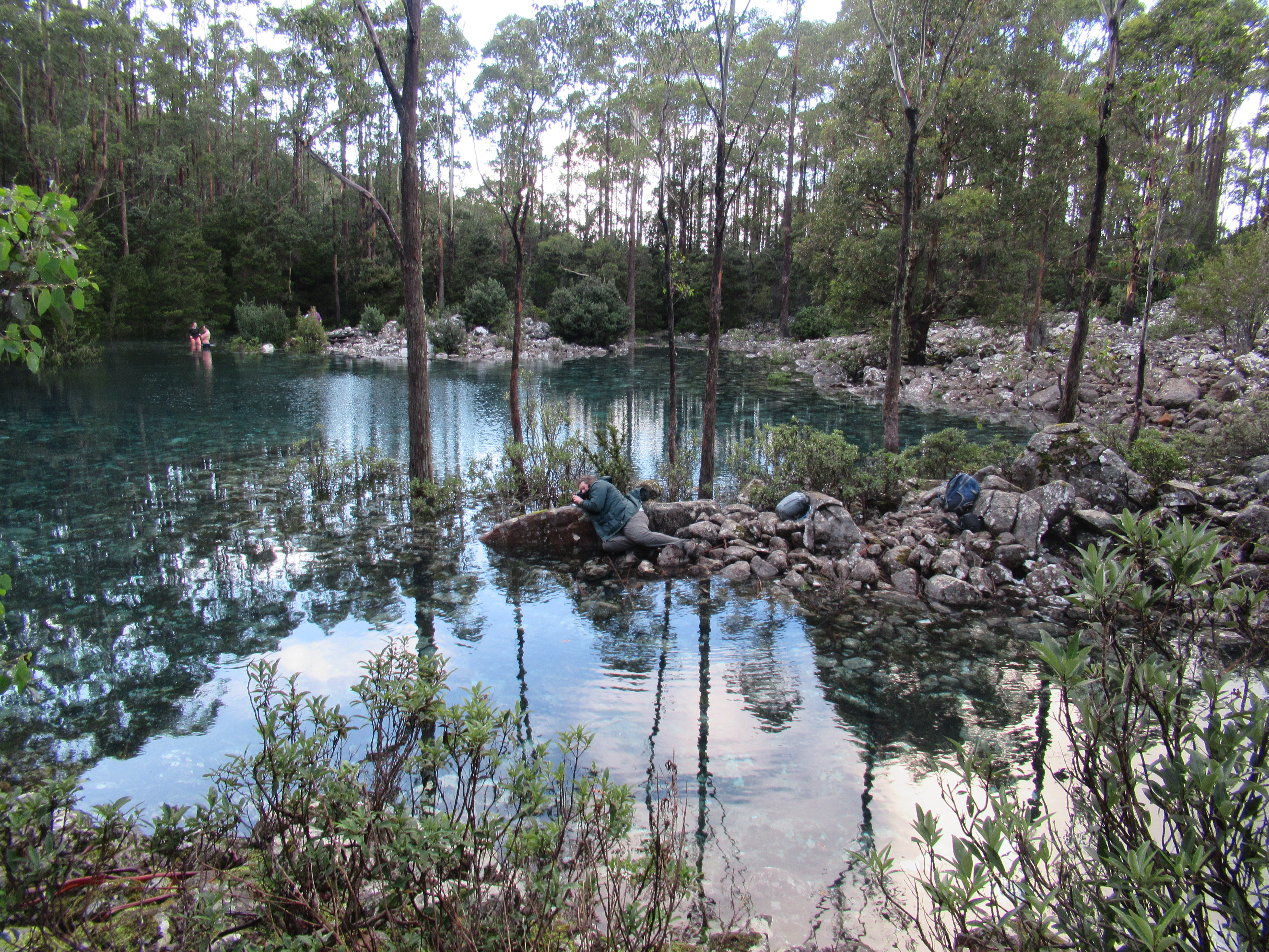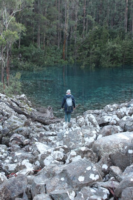 There could have been perfect stillness in the divot in the universe as the rocks muffled sound and the wind only lightly rustled the tree canopy and the water filled almost silently as it is gently filtered through the sand to arrive, clarified and soft coppered-blue, in the cupped hands of Kunanyi, but, alas, our amenity was interrupted by those who had beaten us, and decided to swim. We took a long break on the banks of Disappearing Tarn, waiting our turn for solitude, which came in the form of a soft, stolen moment, between crowds.