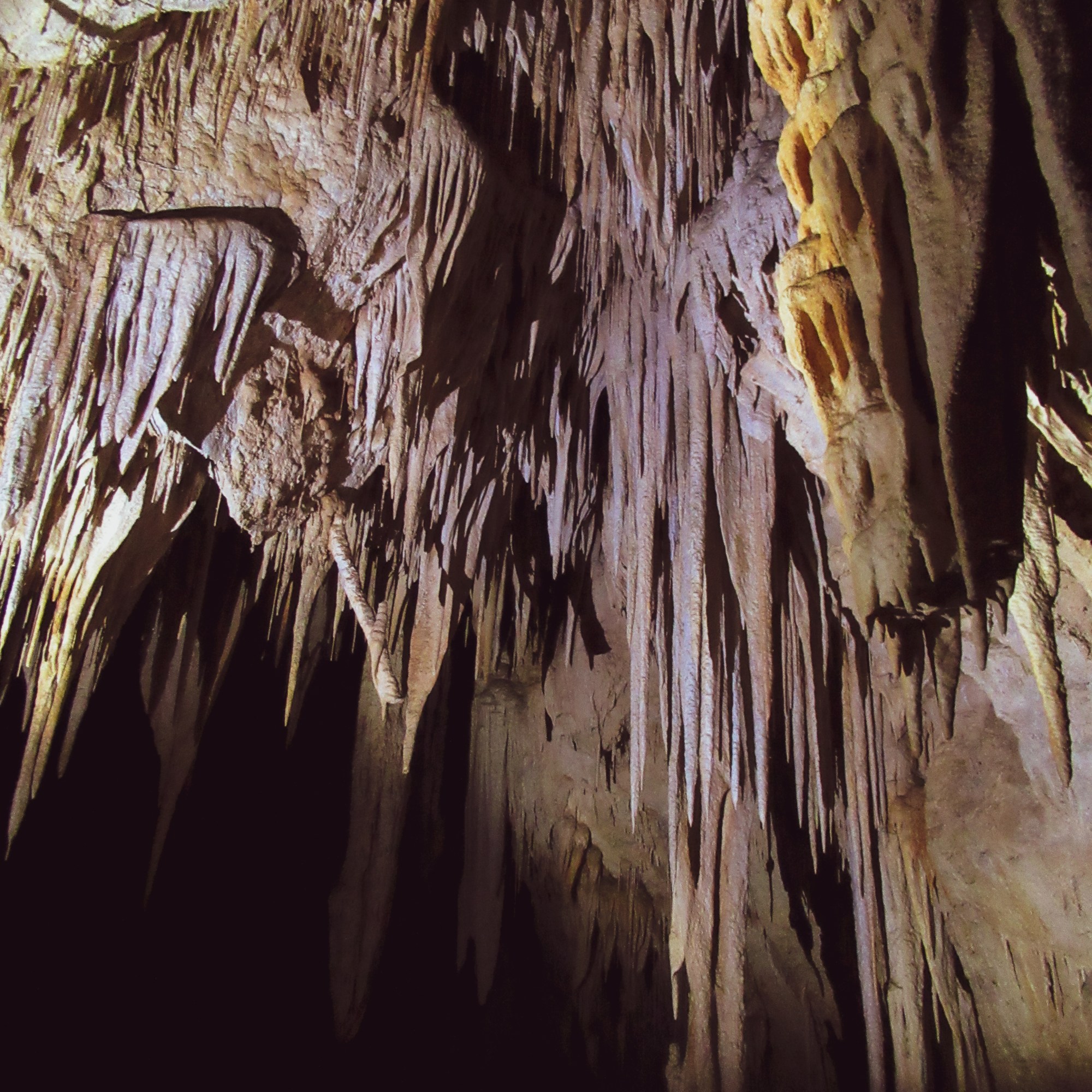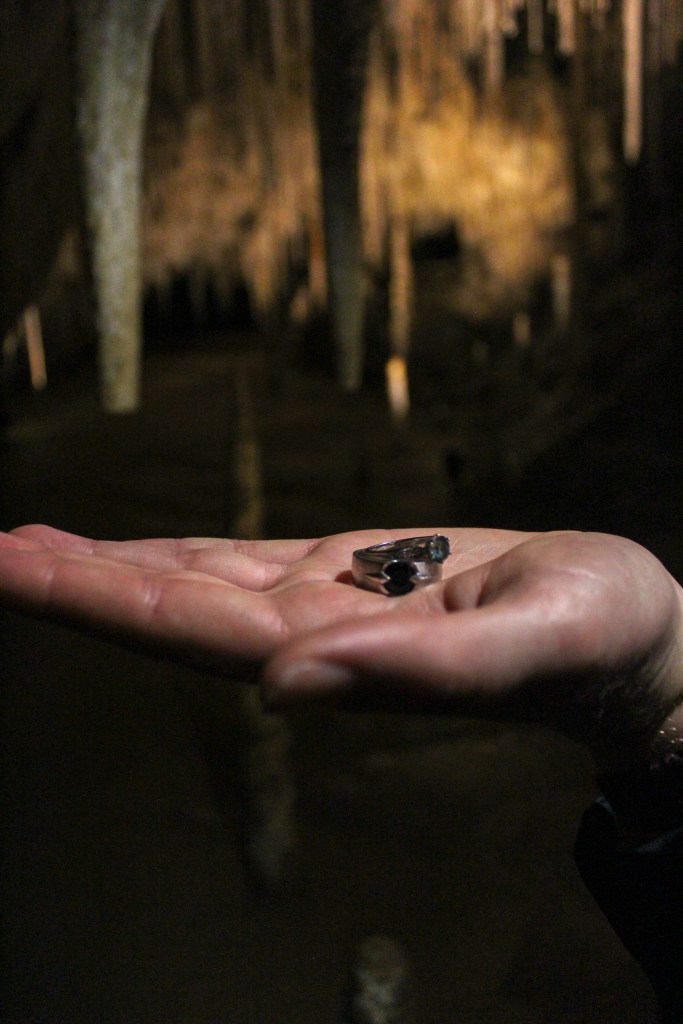 On entry we were gathered in a small, dark chamber. The glittering columns, stalactites and stalagmites were fleetingly illuminated in the pale blue orb of Paddy’s flashlight. The sound of dripping water echoed from the deeper recesses of the cave system, and I busied myself with the distraction of photography (I find it a helpful coping mechanism to focus on the little screen of the camera. It makes me feel as though I just watching a slideshow on a really old phone rather than being trapped in a cave with crystal formations on the ceiling that resemble the devil’s gapping maw) while Paddy explained that the cave was discovered by accident by loggers when a tree fell across the entrance. Lacking proper caving equipment, they returned later with better gear to fully explore.