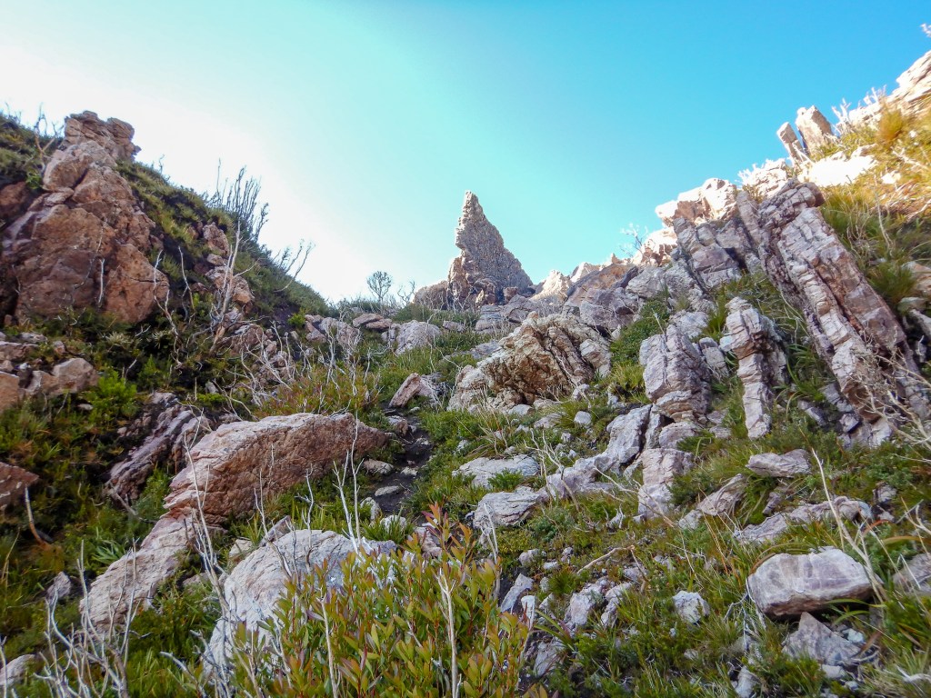 The track in the quartz granite lined zigzag is occasionally marked with very well camouflaged cairns and ascends the base of the range with remarkable ease although this is where we suffered the most from accidental social trail following. We do not recommend this walk in low visibility (for navigation reasons, also because without the view from the top itβs just a really steep, rocky walk).