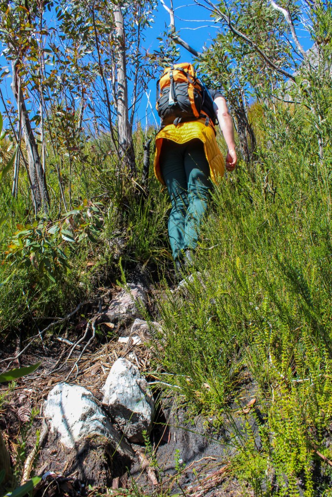 The last 45 minutes before the summit is overgrown but not in such a way as to be impassable. It is very steep, but we were feeling very pleased with our pace until my body (rudely) realised to had eaten a sulphite sometime in the last 2 days (yup, it can take 2 days for symptoms of food intolerances to manifest, especially if only trace amounts are consumed β my allergist assures me this is normal) in what can only be described as a spectacularly inopportune moment. I am lucky that my allergies, while they are a major medical inconvenience, are not a medical emergency. I always carry medication with me and the pain, lethargy and nausea do not incapacitate me, they just slow me right down. If you are also afflicted with a medical condition that might render you in a spontaneous state of medical emergency I strongly advise you to carry an EPIRB you can hire them from Service Tas.