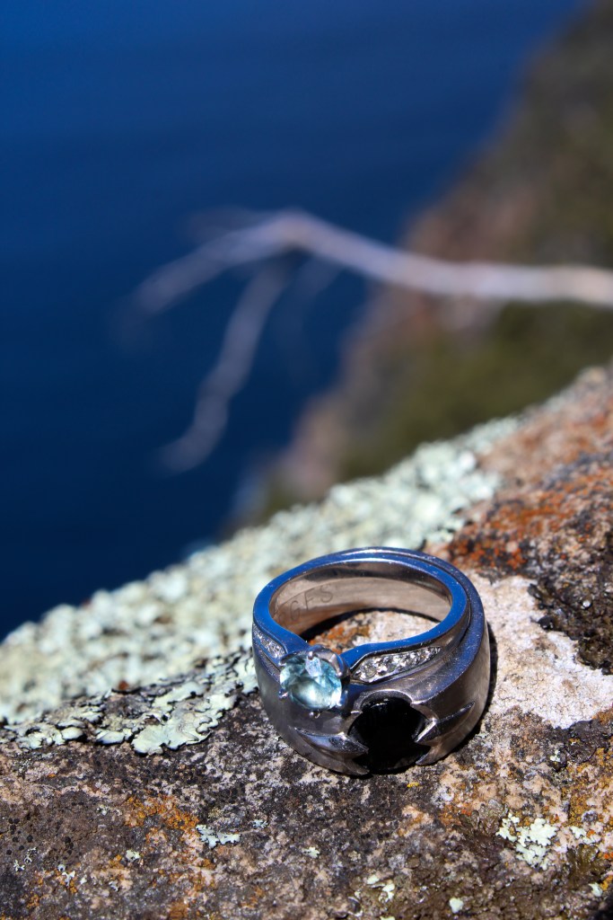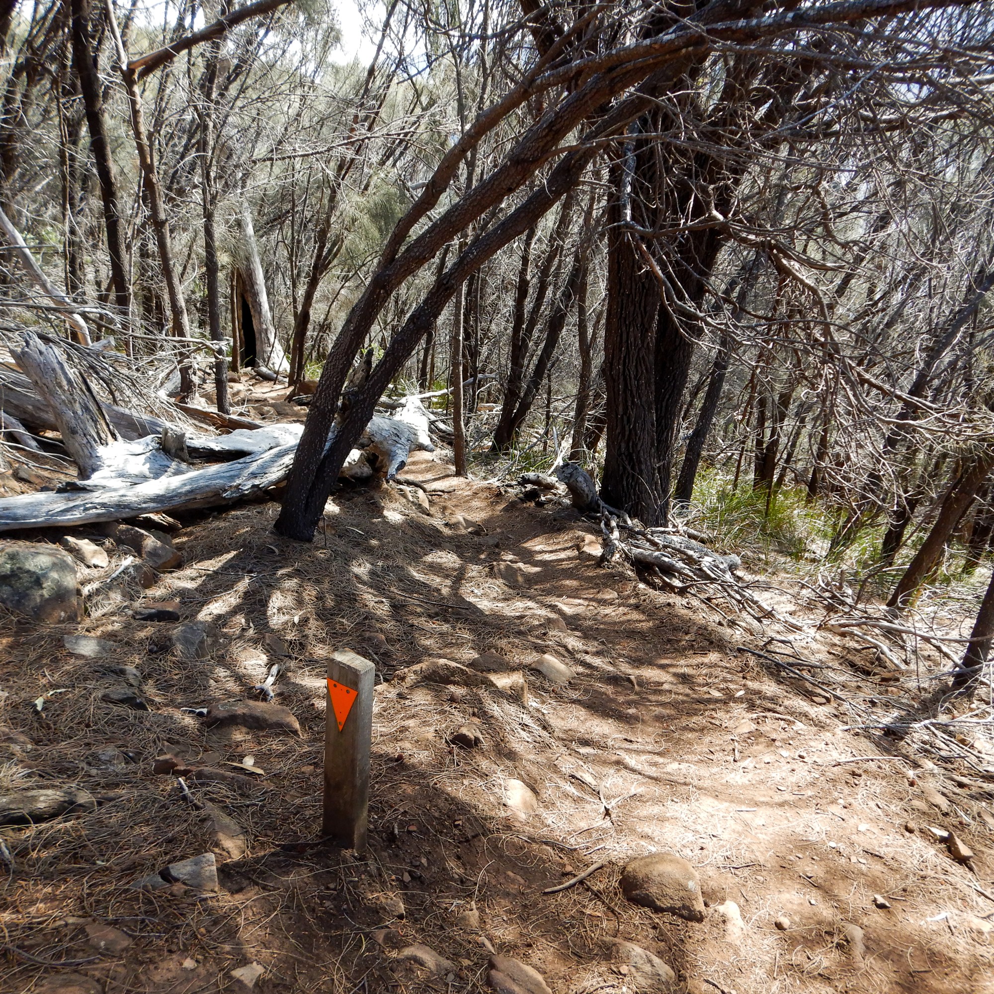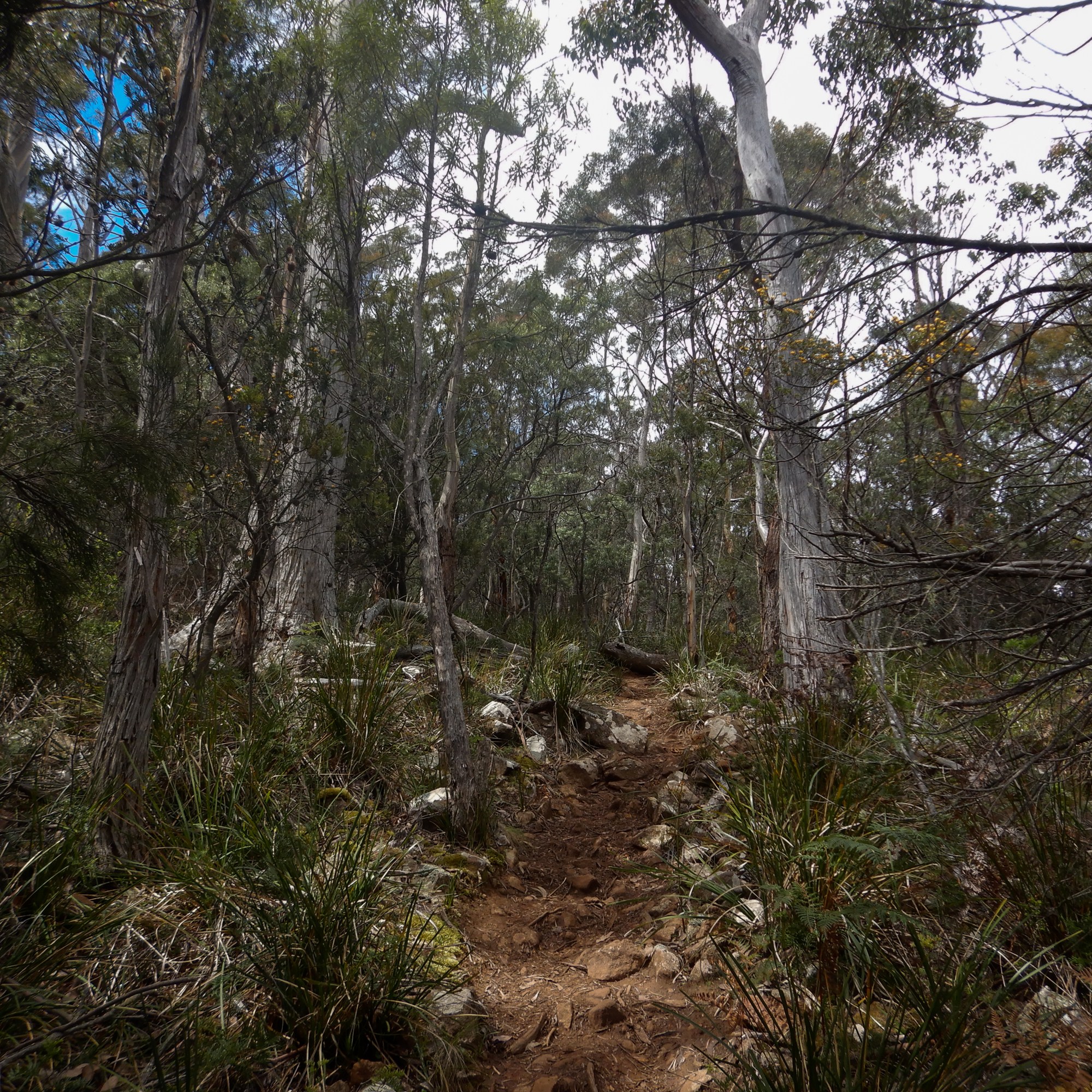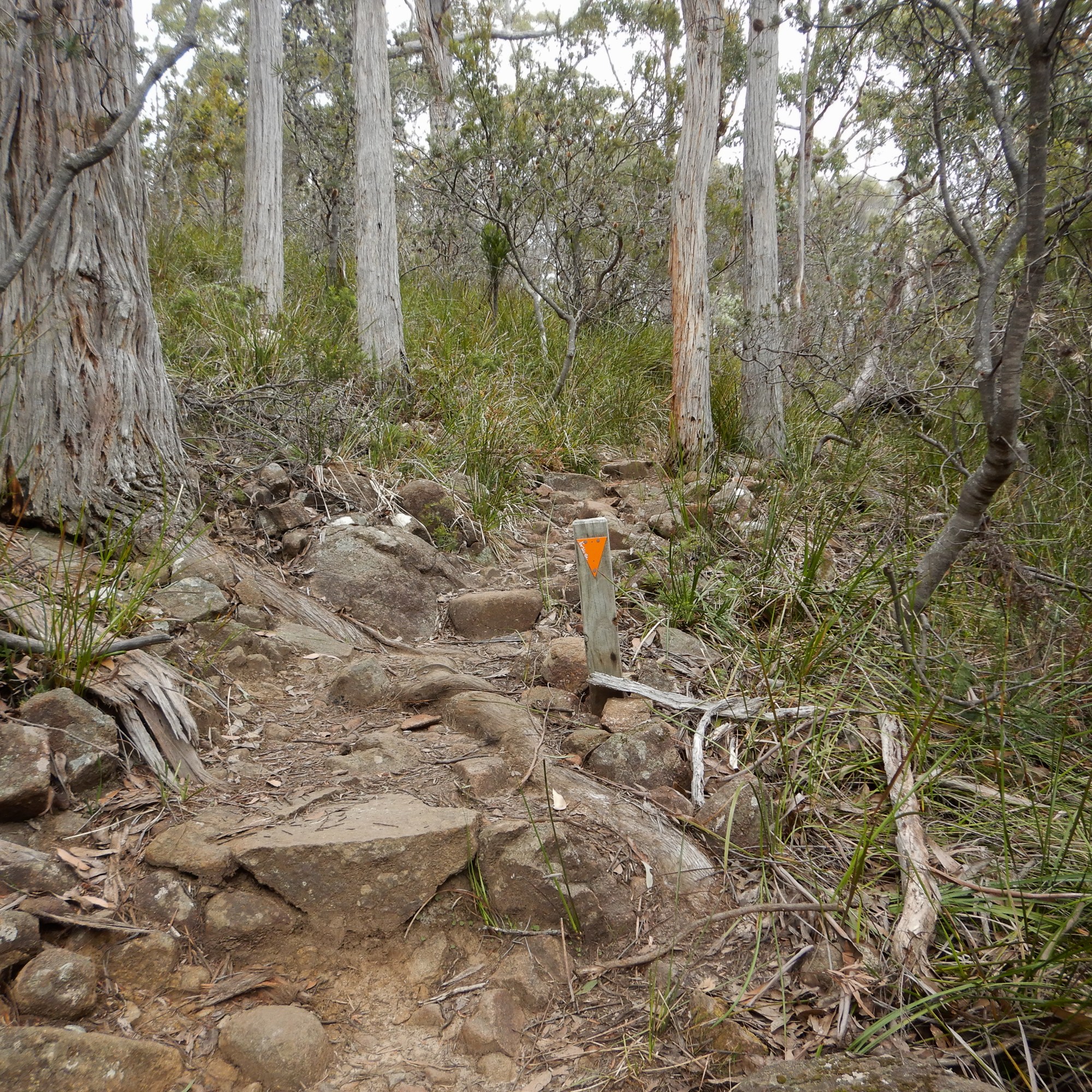 The path is rocky, moderately steep, and densely wooded. We had one minor encounter with a tiger snake who did not wish to be photographed and quickly retreated to the safety of a fallen log well away from the path. Snakes, especially tiger snakes, are a very common sight in Tasmania. We have had many very close (and not always welcome) encounters, but mostly we both keep to ourselves and have no issues. We carry 5 bandages with us in warmer months (only 2 sanitary ones in winter), we generally walk slowly through areas that would make good snake habitats so that we can freeze in place easy if we come across one. As a further snake precaution I always walk in front; unlike Sommelier, I do not need spectacles to see and therefore have a fuller field of peripheral vision. I also assume all sticks are snakes until proven otherwise (tree roots and most fallen bark is also subject to scrutiny).