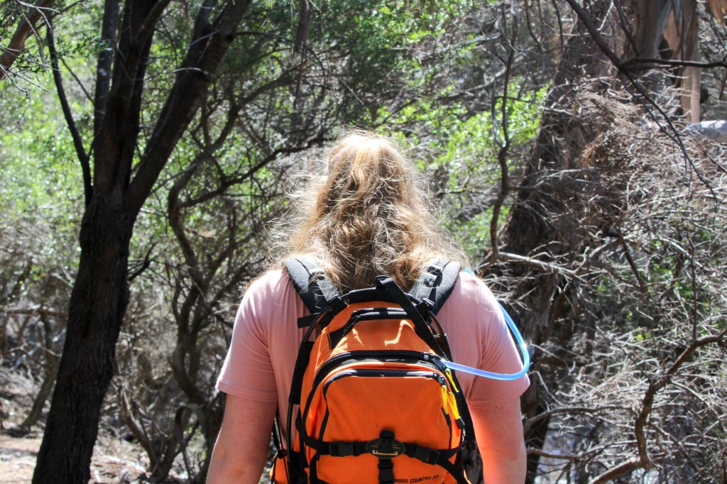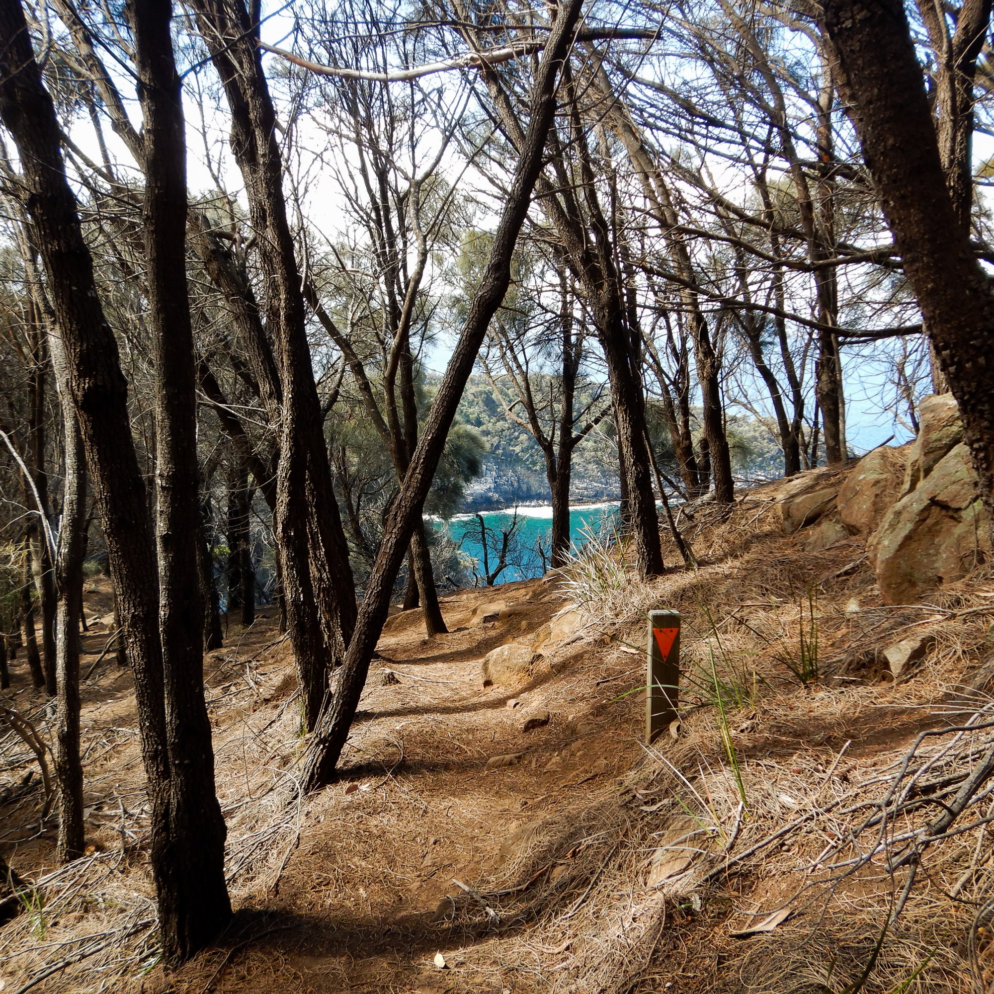 The Grass Point section of the trail is mostly she-oak and other slippery leaf-litter prone plants. The steep downhill made for occasional fraught moments of slippage, but there were no major incidents, and while the cliffs are visible for the entire way, they are a safe distance. We took many opportunities to admire the peak of the Cape bathed in the beating afternoon sun. Penguin island spread out below us, the soft calls of sleepy penguins occasionally carrying over to us once we were close enough to hear them.