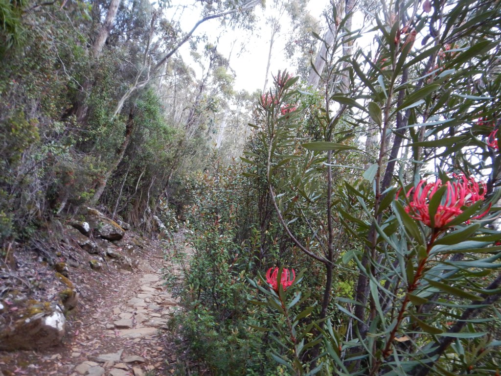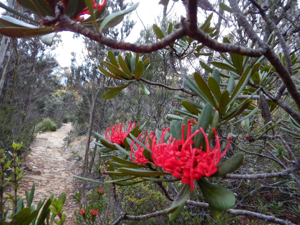 The path is moderately steep, neatly paved and only somewhat uneven. There are a few stairs and very few places to rest along the way. There is also a sheer drop on one side of the narrow path for most of the journey so children require supervision and walking in low visibility can be a little tricky. With all that in mind it should be noted that, other than one minor stepping too far back to take a photo incident we found the way to be easy and pleasantly filled with birdsong and the promised brilliant scarlets of the waratah which grows close to the path for convenience of photography.